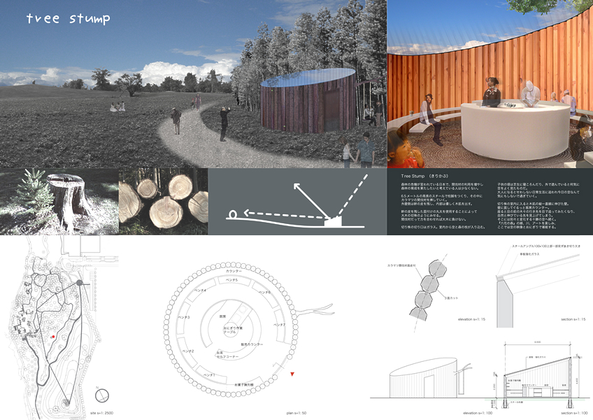 森林の危機が言われている日本で、間伐材の利用を増やし森林の育成を果たしたいと考えている人は少なくない。 6.5メートルの周長のスチールで柱脚をつくり、その中にカラマツの間伐材を挿していく。外壁側は幹の皮を残し、内部は優しく木肌を出す。幹の皮を残した面付けの丸太を使用することによって大木の切株のようにみせる。間伐材だって力を合わせれば大木に負けない。 切り株の切り口はガラス。室内から空と森の枝が入り込む。 子供の頃は芝生に寝ころんだり、外で遊んでいると何気に空をよく見たものだ。大人になるとせわしない日常生活に追われ今日の空なんて気にもしないで過ぎていく。 切り株の室内に入ると木肌の縦一直線に伸びた壁。壁に面してぐるっと客席カウンター。座ると目の前の木々の行き先を目で追ってみたくなり、自然と伸びている先を見上げてしまう。そこには刻々と変化する十勝の空へ続く。『六花の森』の緑、川、アートを楽しみ、ここでは空の映像とおにぎりで堪能する。
