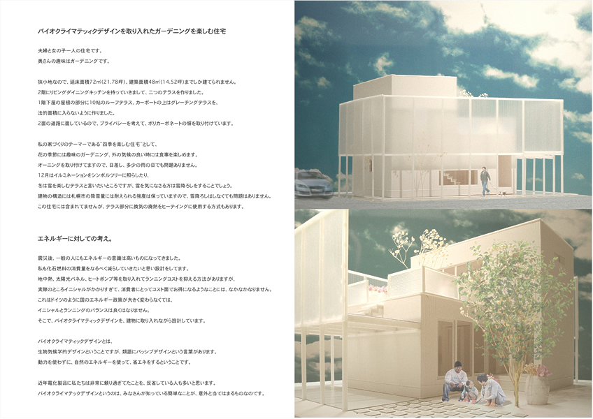 夫婦と女の子一人の住宅です。奥さんの趣味はガーデニングです。狭小地なので、延床面積72㎡(21.78坪)、建築面積48㎡(14.52坪)までしか建てられません。2階にリビングダイニングキッチンを持っていきまして、二つのテラスを作りました。1階下屋の屋根の部分に10帖のルーフテラス、カーポートの上はグレーチングテラスを、法的面積に入らないように作りました。2面の道路に面しているので、プライバシーを考えて、ポリカーボネートの塀を取り付けています。 私の家づくりのテーマである“四季を楽しむ住宅”として、花の季節には趣味のガーデニング、外の気候の良い時には食事を楽しめます。オーニングを取り付けてますので、日差し、多少の雨の日でも問題ありません。12月はイルミネーションをシンボルツリーに照らしたり、冬は雪を楽しむテラスと言いたいところですが、雪を気になさる方は雪降ろしをすることでしょう。建物の構造には札幌市の降雪量には耐えられる強度は保っていますので、雪降ろしはしなくても問題はありません。この住宅には含まれてませんが、テラス部分に換気の廃熱をヒーテイングに使用する方式もあります。
