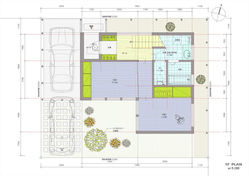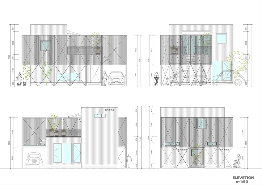 奥さんの趣味はガーデニングです。狭小地なので、延床面積72㎡(21.78坪)、建築面積48㎡(14.52坪)までしか建てられません。2階にリビングダイニングキッチンを持っていきまして、二つのテラスを作りました。1階下屋の屋根の部分に10帖のルーフテラス、カーポートの上はグレーチングテラスを、法的面積に入らないように作りました。2面の道路に面しているので、プライバシーを考えて、ポリカーボネートの塀を取り付けています。