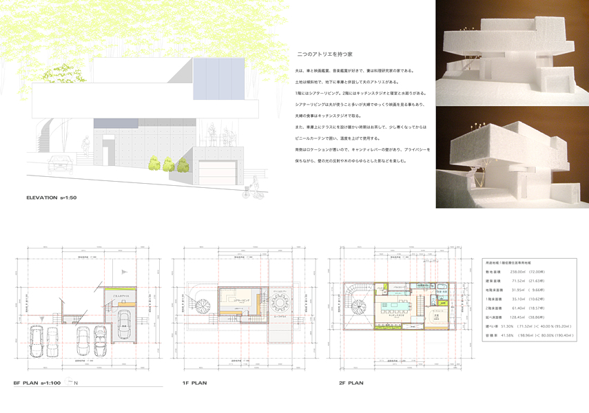 夫は、車と映画鑑賞、音楽鑑賞が好きで、妻は料理研究家の家である。 土地は傾斜地で、地下に車庫と併設して夫のアトリエがある。 1階にはシアターリビング。2階にはキッチンスタジオと寝室と水廻りがある。 シアターリビングは夫が使うことが多いが夫婦でゆっくり映画を見る事もあり、夫婦の食事はキッチンスタジオでとる。また、車庫上にテラスを設け暖かい時期はお茶して、少し寒くなってからはビニールカーテンで囲い、温度を上げて使用する。南側はロケーションが悪いので、キャンティレバーの壁があり、プライバシーを保ちながら、壁の光の反射や木のゆらゆらとした影などを楽しむ。