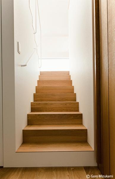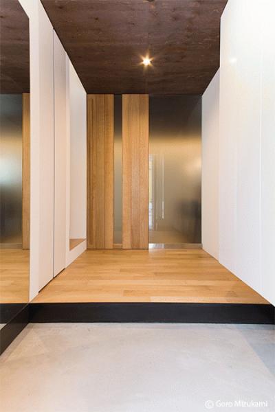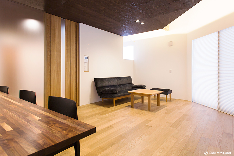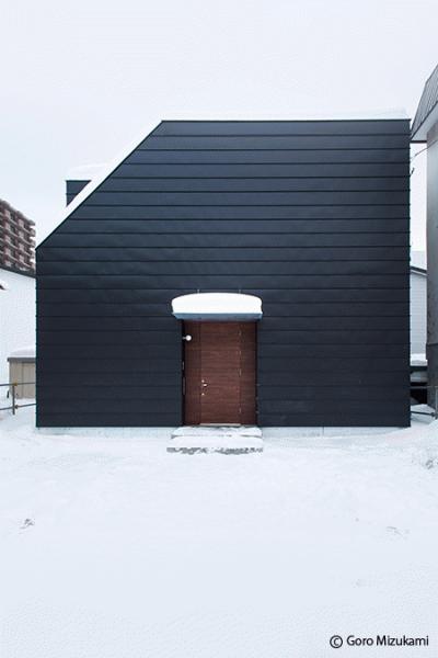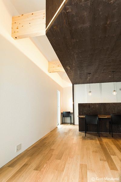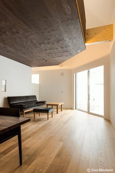 四角形の平面のひとつの角を斜めにカットすることで、限られた敷地の中で外部に庭を造り、斜めの壁を含む3方に吹抜けをもつ。