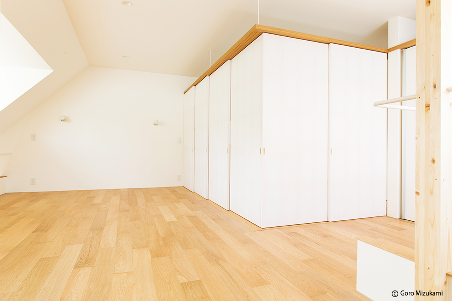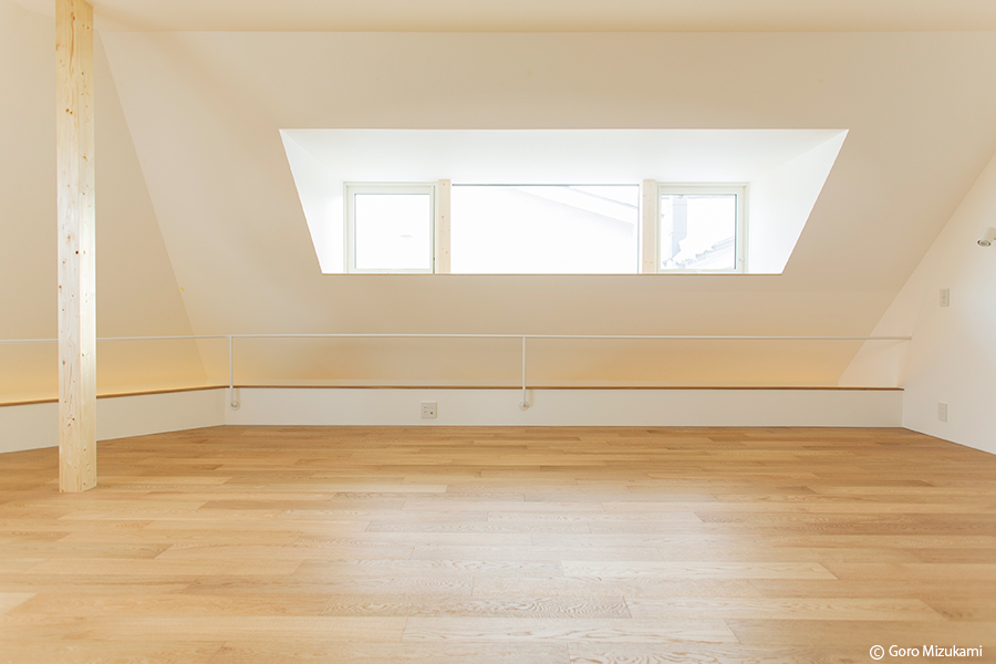 2階では、その吹抜けから連続する屋根の勾配がそのまま現れ、飾り棚にもなる横長の出窓から、採光と通気を確保している。