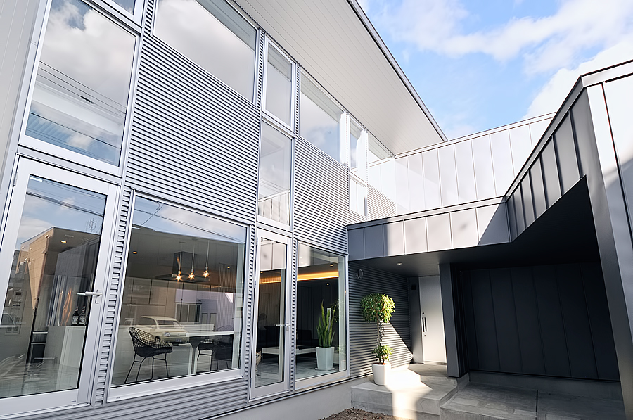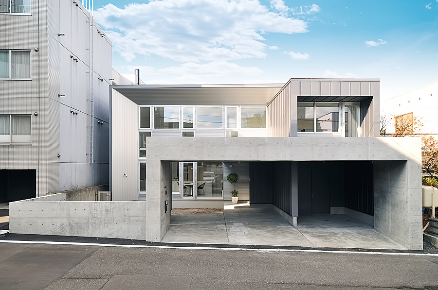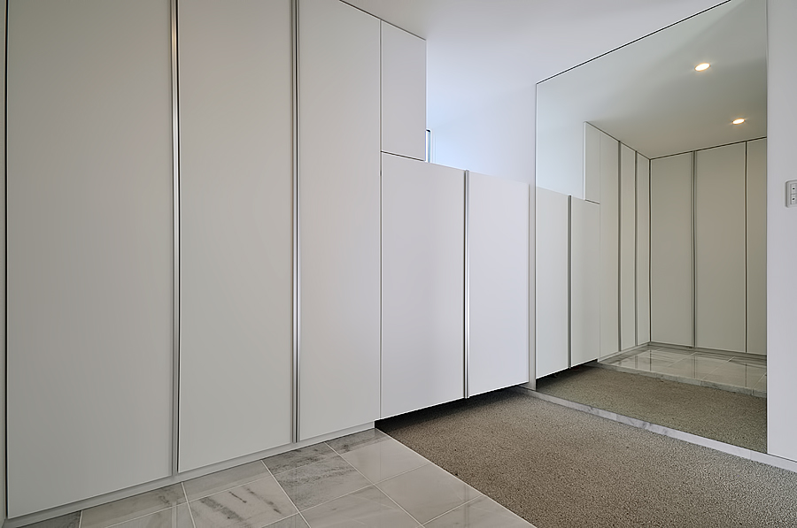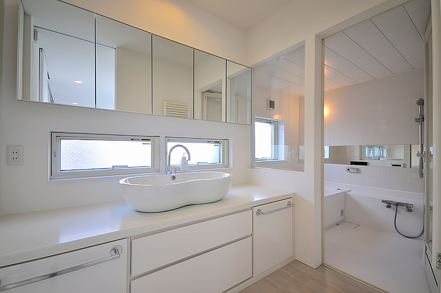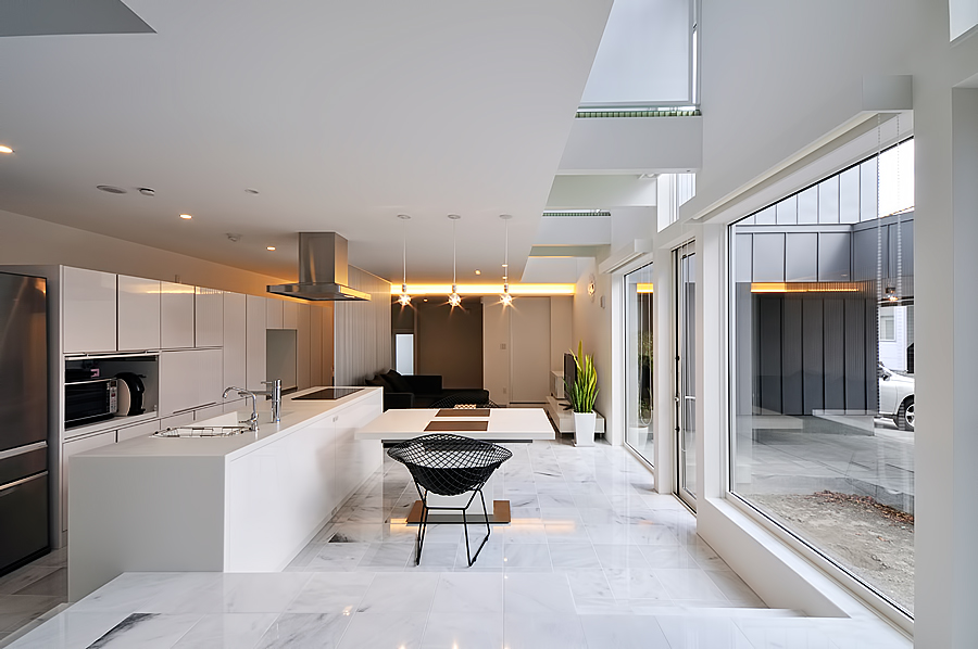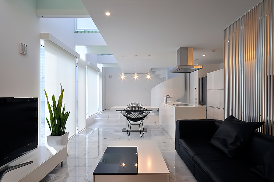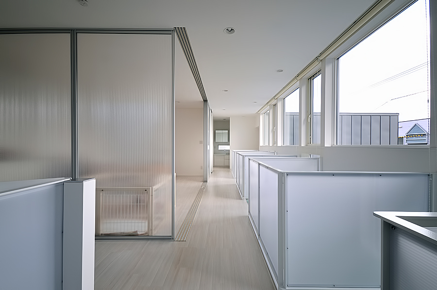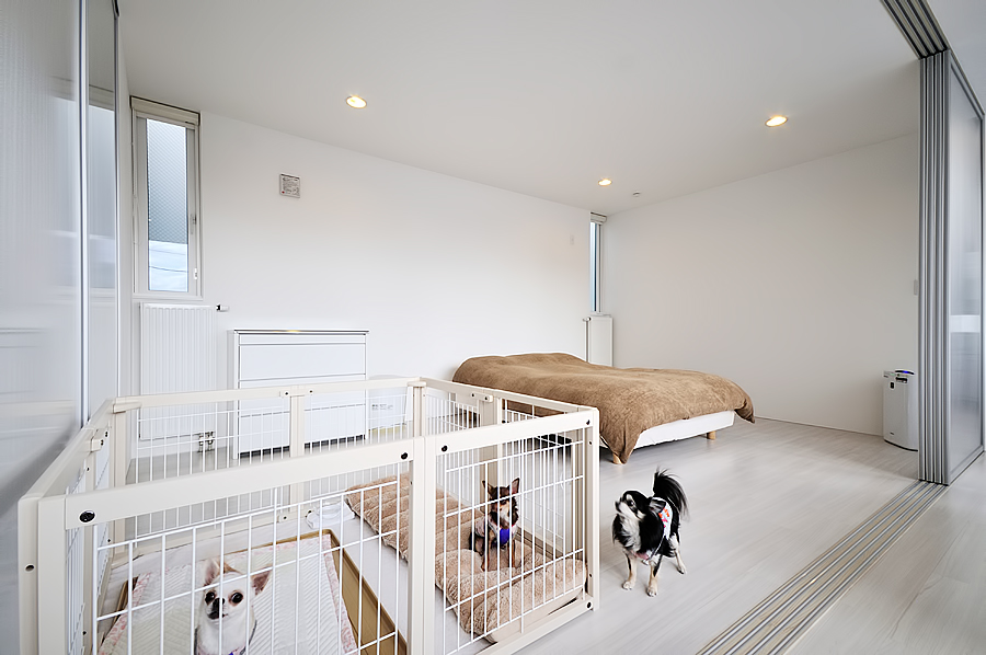 4匹のわんちゃんと暮らす住宅。内部は白を基調とした空間になっていて、リビングにはステージがあり、そこから2階へ螺旋階段がのびている。 窓際は吹抜になっていて、上部からも光が差し込むとともに、別の階にいるわんちゃんの気配を感じられるようになっている。