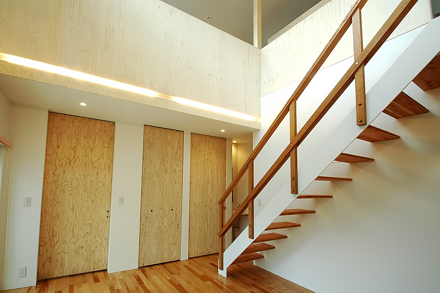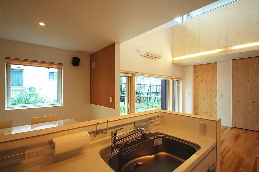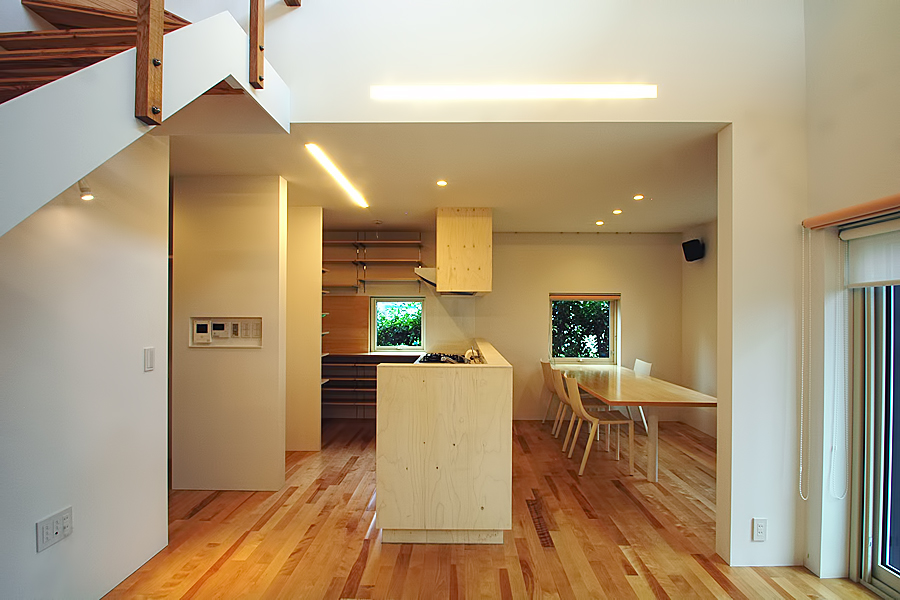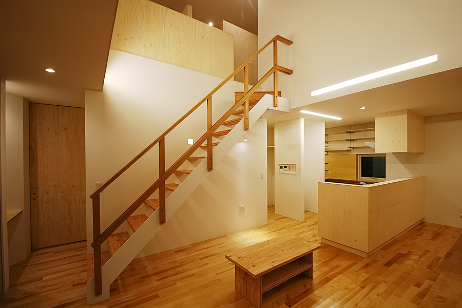 リビングには吹抜けがあり、2階の吹き抜けに面した部分には、4人の子供が並んで勉強できるカウンタースペースがある。
