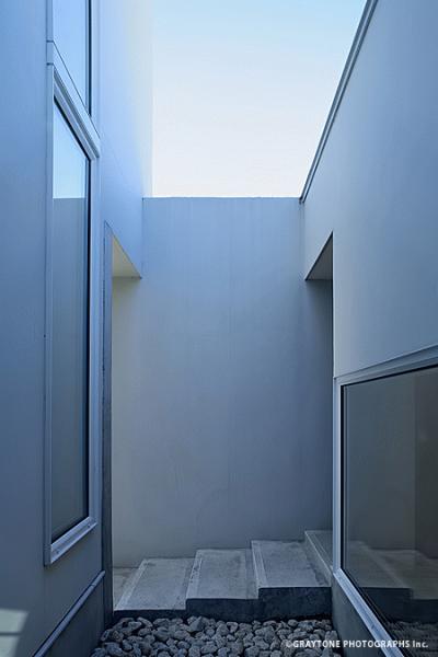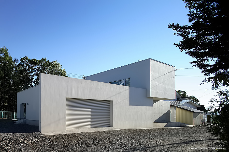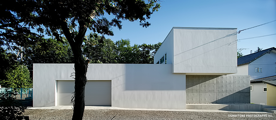 コンクリートの壁と二つの白い壁が異なる奥行きで交合う建築です。