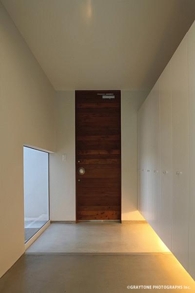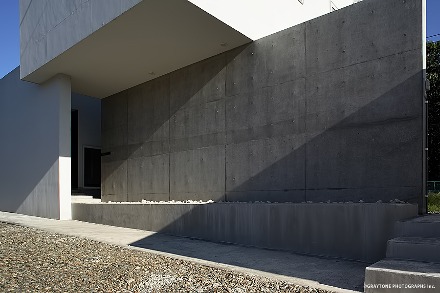 コンクリートの壁と二つの白い壁が異なる奥行きで交合う住宅
