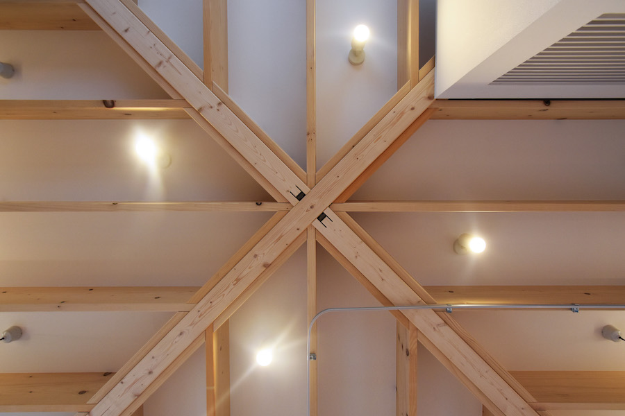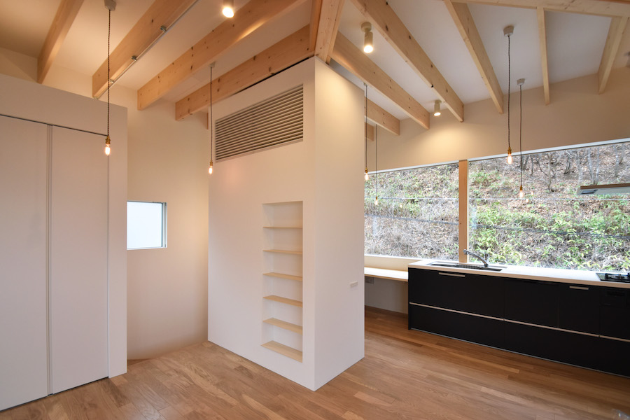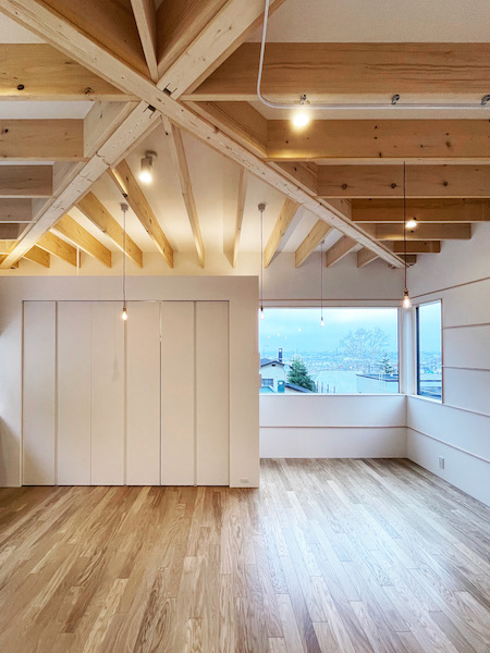 札幌市内の山の緑が多くて、街がみえる場所に小さい住宅ができました。正方形の建物を斜めの対角の梁がこの建物を支えます。