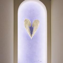 中待合室では佐藤氏の"天使の羽"が出迎える。