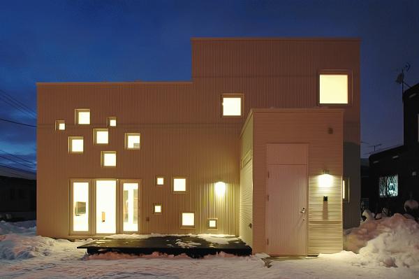 リビングにランダムに配された開口を持つ住宅