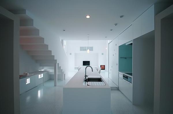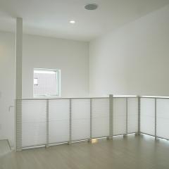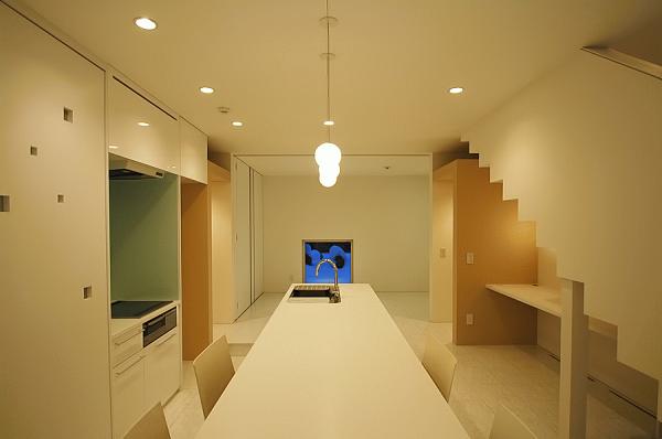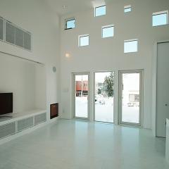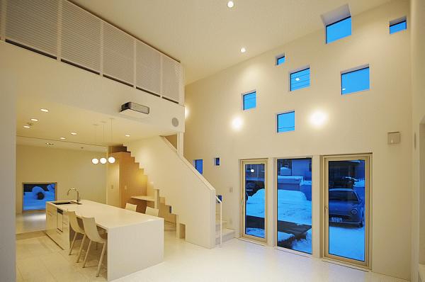 天井高さ4mのリビングの両サイドに四角い開口がランダムに配されており、光が差し込むと同時に四角いソラがリビングに浮かぶ。Q値:1.27