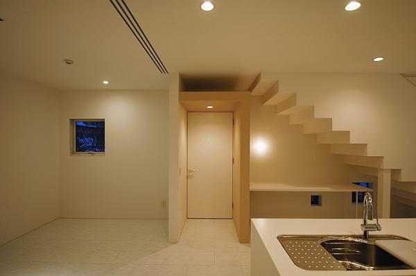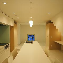 天井高さ4mのリビングの両サイドに四角い開口がランダムに配されており、光が差し込むと同時に四角いソラがリビングに浮かぶ。