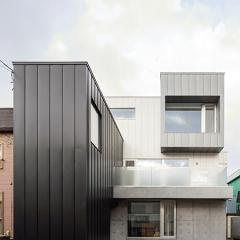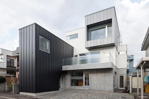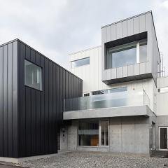 親世帯は1階、子世帯は2、3階で住み分ける二世帯住宅。1階がコンクリート造、2、3階は木造で立体が重なり合った外観をもつ。2階のキッチンからはリビングとそこに隣接する勉強スペースを眺められる、間取りになっている。