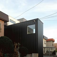 1階がコンクリート造、2、3階は木造で立体が重なり合った外観をもつ。