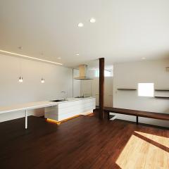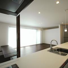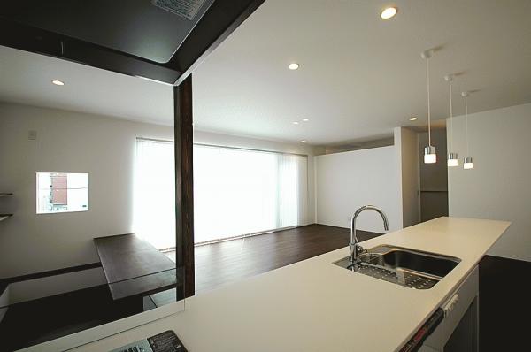 2階のキッチンからはリビングとそこに隣接する勉強スペースを眺められる、間取りになっている。