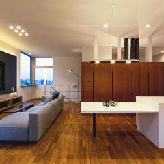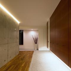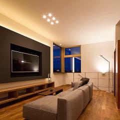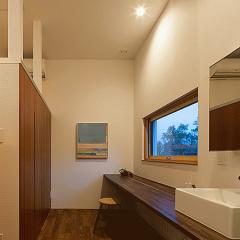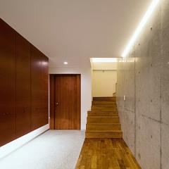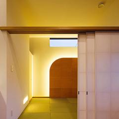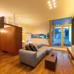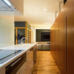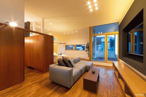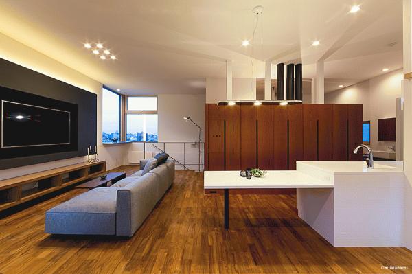 1階はガレージと広めの玄関、2階は個室と水まわり、3階は天井の高い一体空間となっていて、その中にリビングや、キッチン、和室などが配されている。リビングからは街並とテラス越しに円山を見渡すことができる。Q値:0.85、C値:0.4