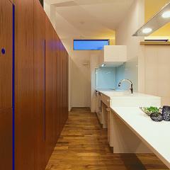 1階はガレージと広めの玄関、2階は個室と水まわり、3階は天井の高い一体空間となっていて、その中にリビングや、キッチン、和室などが配されている。
