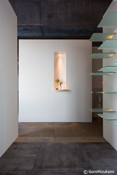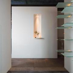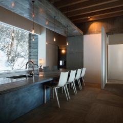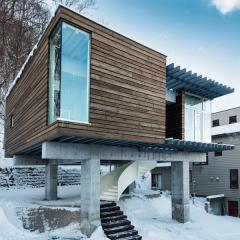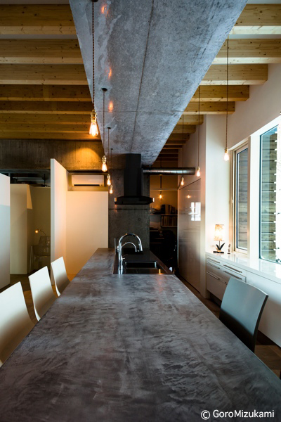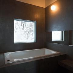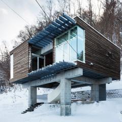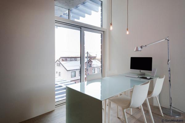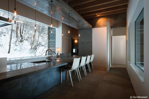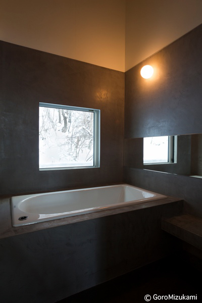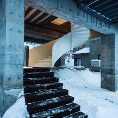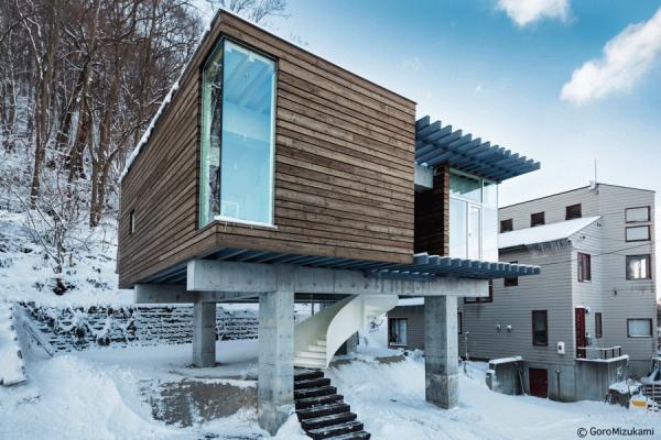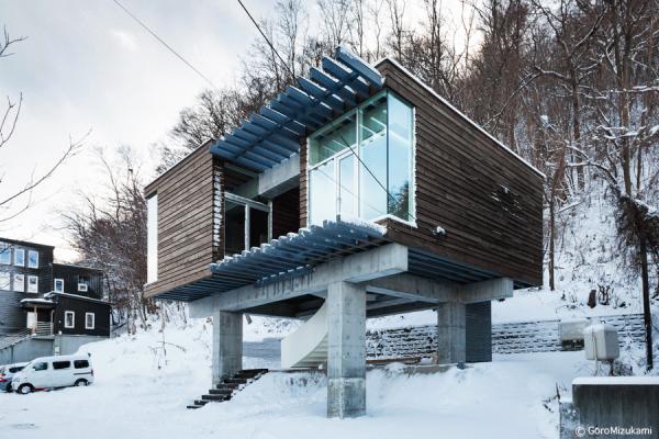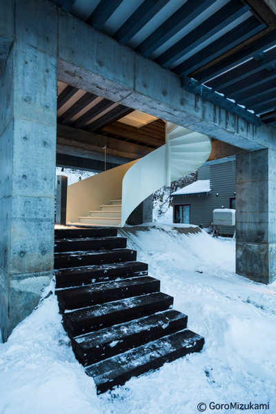 神社山を背にするこの敷地は土砂災害特別警戒区域に指定されており、移動する土石をかわすように、鳥居型の鉄筋コンクリート構造の架構によって、建物は鳥居の一部を隠すように宙に浮いている。室内空間にもこの構造は現れており、木の梁を支えている。ダイニングキッチン正面の大きな窓には、神社山の四季の移ろいや、小動物の気配が映し出され、建物の角に設けられた窓からは、札幌の市街地や、遠方の山を望むことができる。